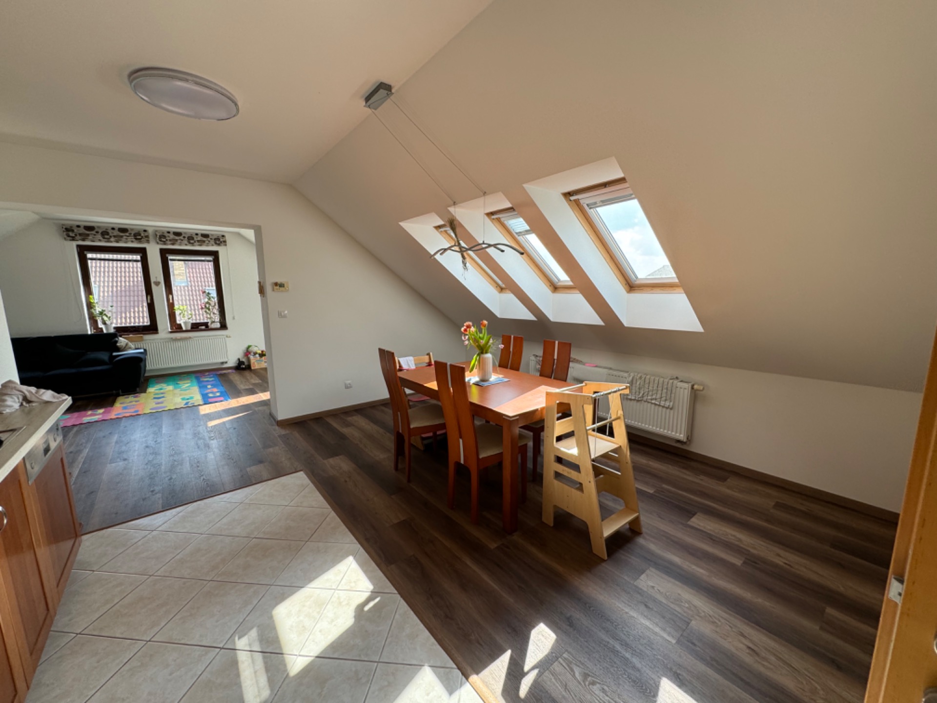 Tento byt se v nabídce příliš dlouho neohřál a byl o něj velký zájem, neboť disponuje podlahovou plochou přes 100 m2 a je kompletně vybaven nejkvalitnějšími spotřebiči včetně pračky a sušičky. Má 2 koupelny, jednu s vanou a druhou se sprchovým koutem + technické zázemí. Nechybí šatna, kuchyňská linka a veškeré zařízení včetně dětského pokoje.